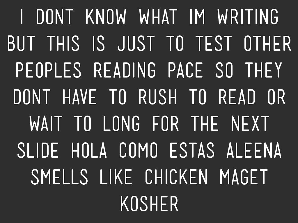 I dont know what im writing but this is just to test other peoples reading pace so they dont have to rush to read or wait to long for the next slide hola como estas aleena smells like chicken maget kosher