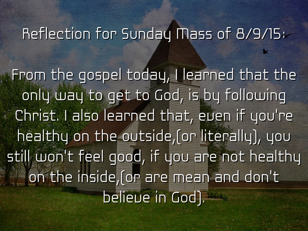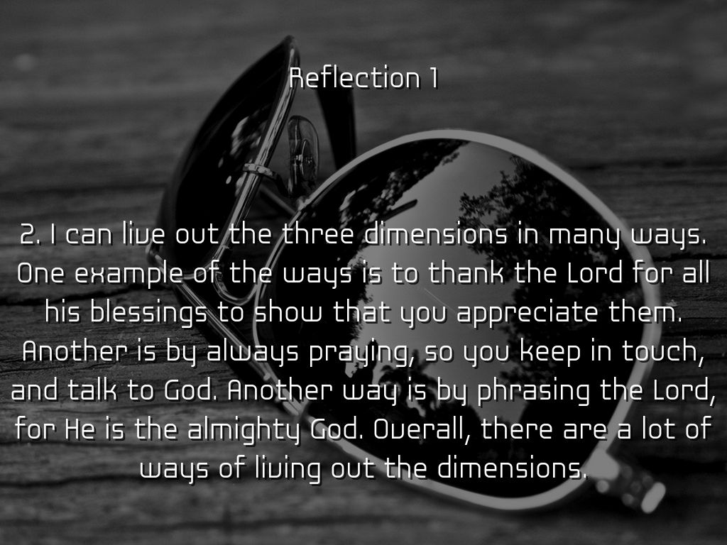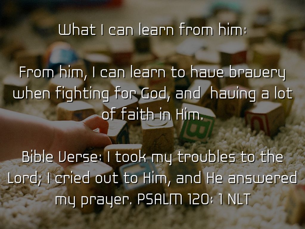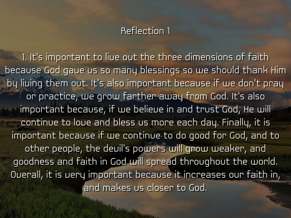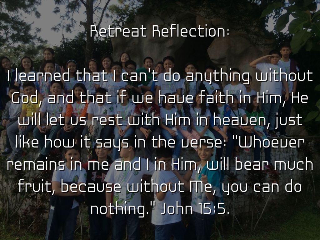 I learned that I can't do anything without God, and that if we have faith in Him, He will let us rest with Him in heaven, just like how it says in the verse: "Whoever remains in me and I in Him will bear much fruit , because without me, you can do nothing." John 15:5