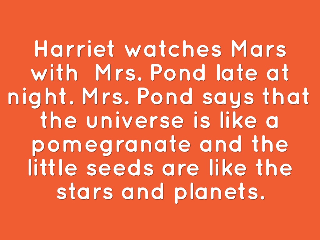 Harriet watches Mars with Mrs. Pond late at night. Mrs. Pond says that the universe is like a pomegranate and the little seeds are like the stars and planets.