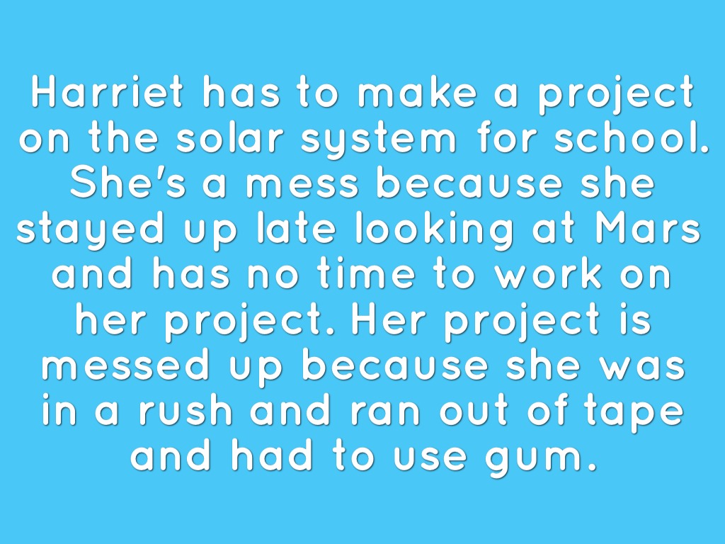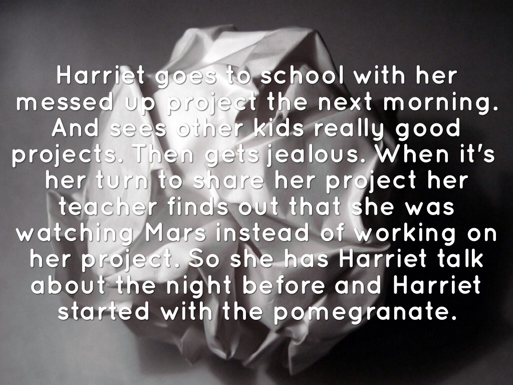 Harriet goes to school with her messed up project the next morning. And sees other kids really good projects. Then gets jealous. When it's her turn to share her project her teacher finds out that she was watching Mars instead of working on her project. So she has Harriet talk about the night before and Harriet started with the pomegranate.