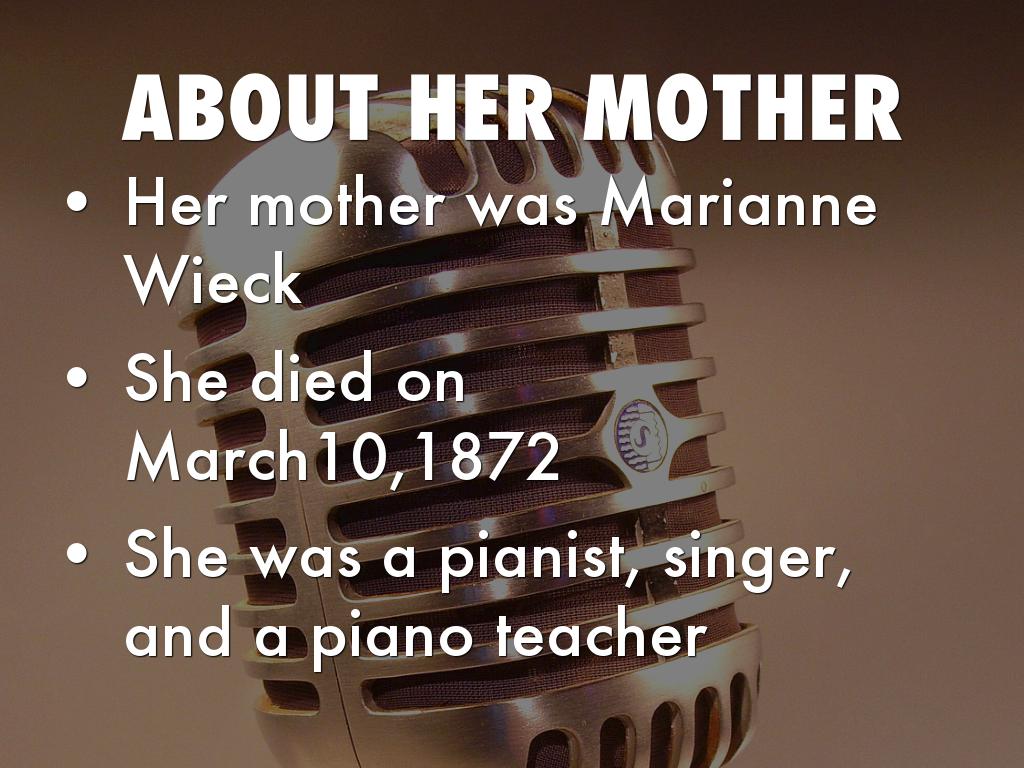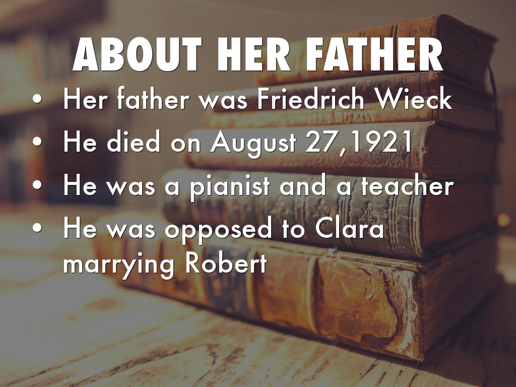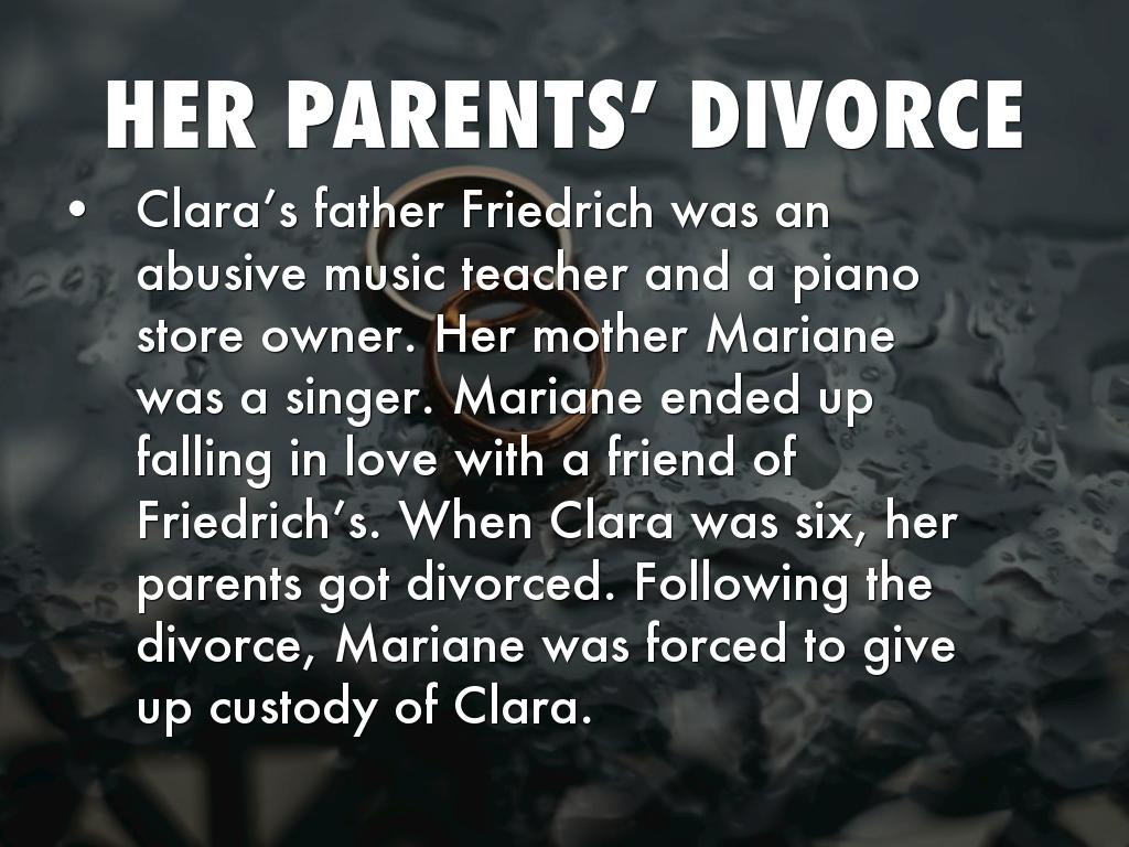 • Clara’s father Friedrich was an abusive music teacher and a piano store owner. Her mother Mariane was a singer. Mariane ended up falling in love with a friend of Friedrich’s. When Clara was six, her parents got divorced. Following the divorce, Mariane was forced to give up custody of Clara.