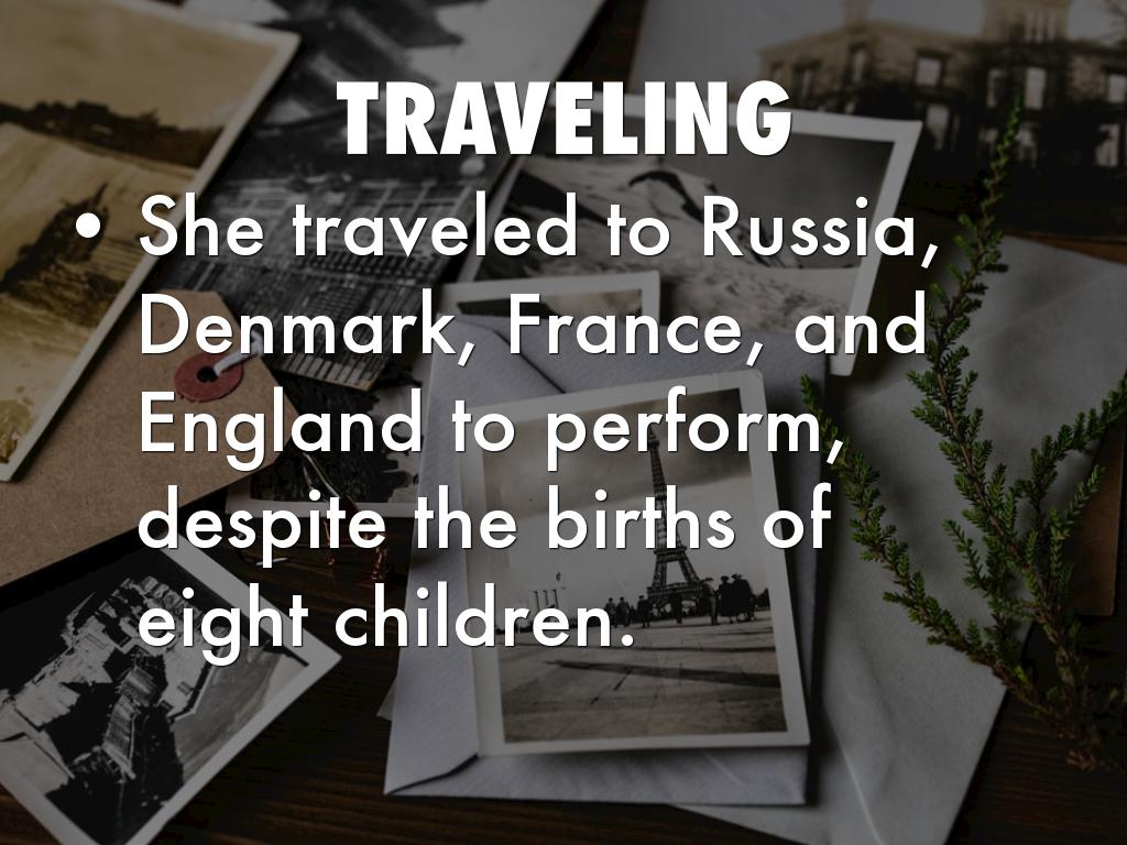 • She traveled to Russia, Denmark, France, and England to perform, despite the births of eight children.