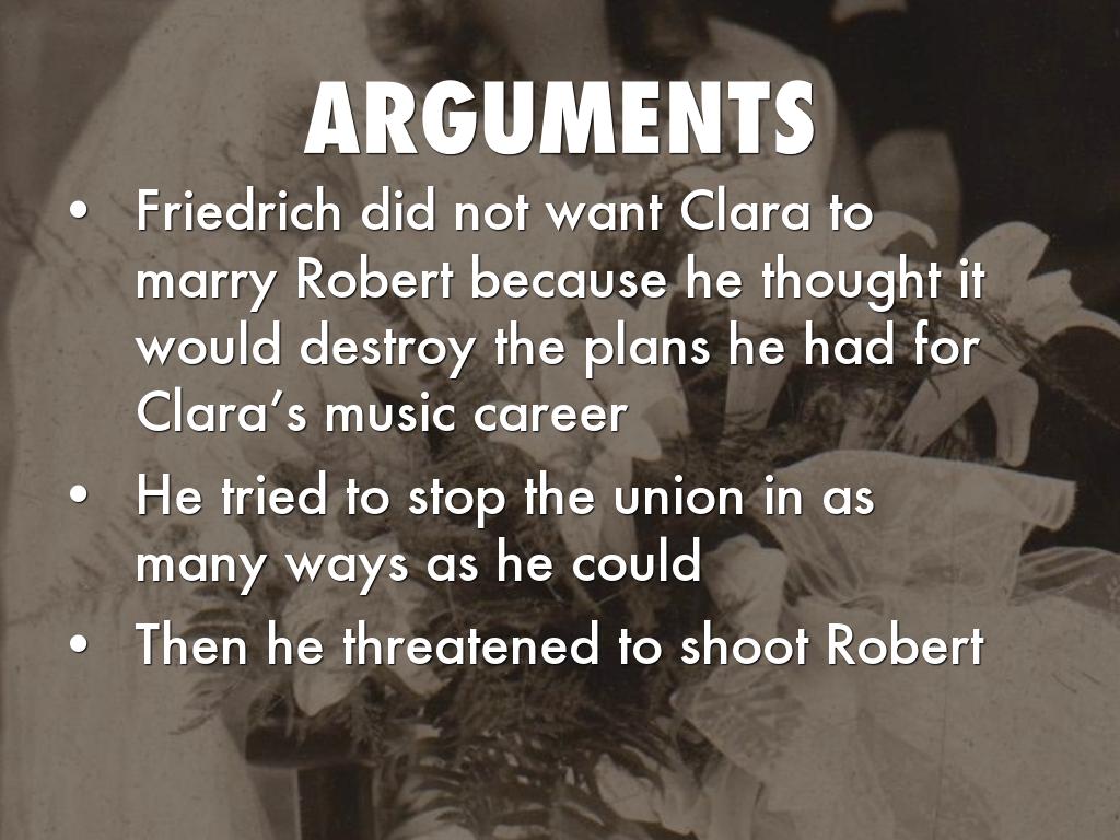 • Friedrich did not want Clara to marry Robert because he thought it would destroy the plans he had for Clara’s music career