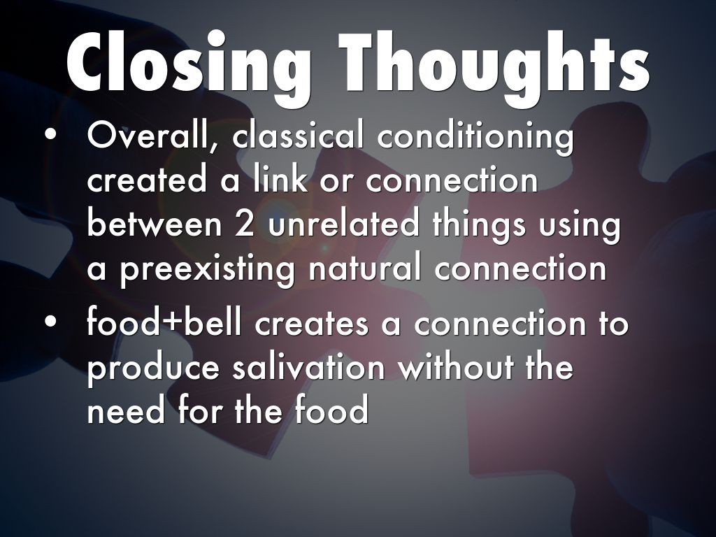 Overall, classical conditioning created a link or connection between 2 unrelated things using a preexisting natural connection