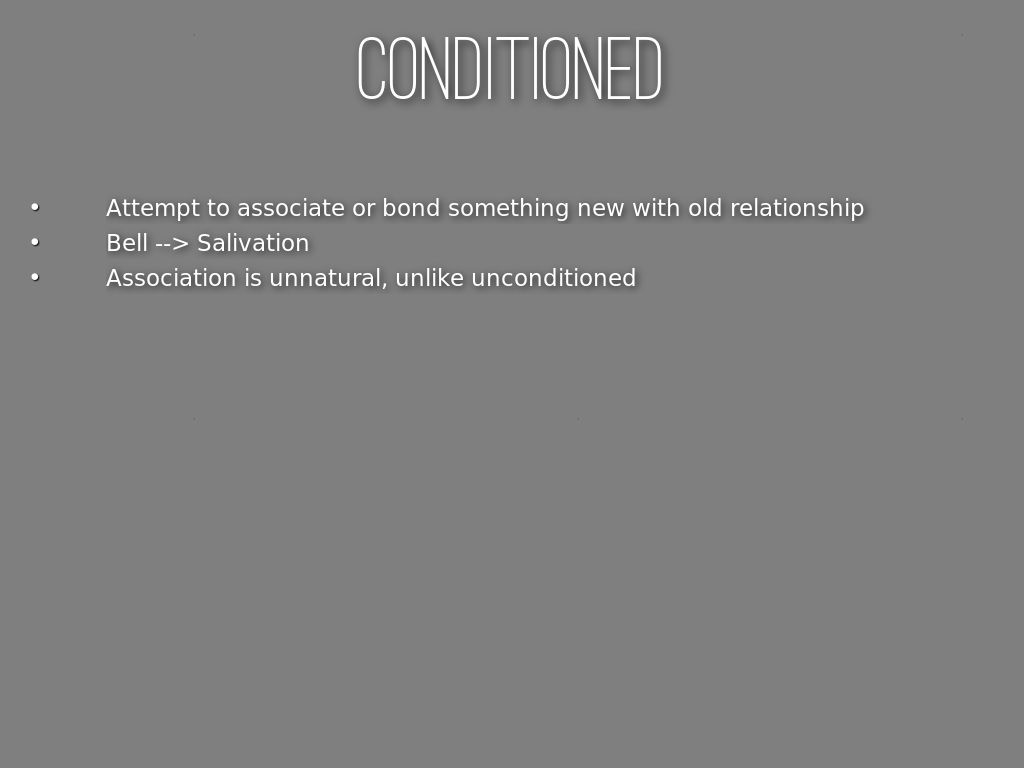 Bell --> SalivationConditioned Stimulus --> Conditioned Response