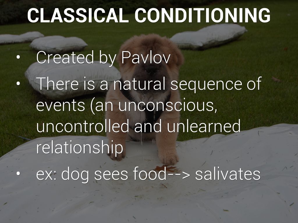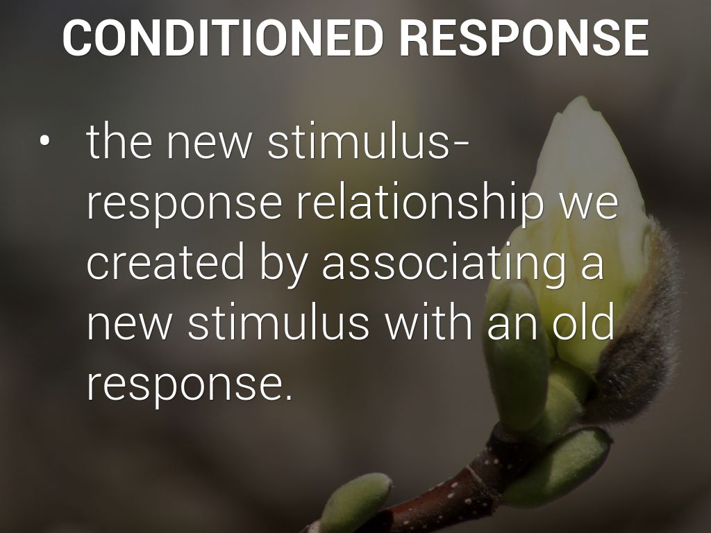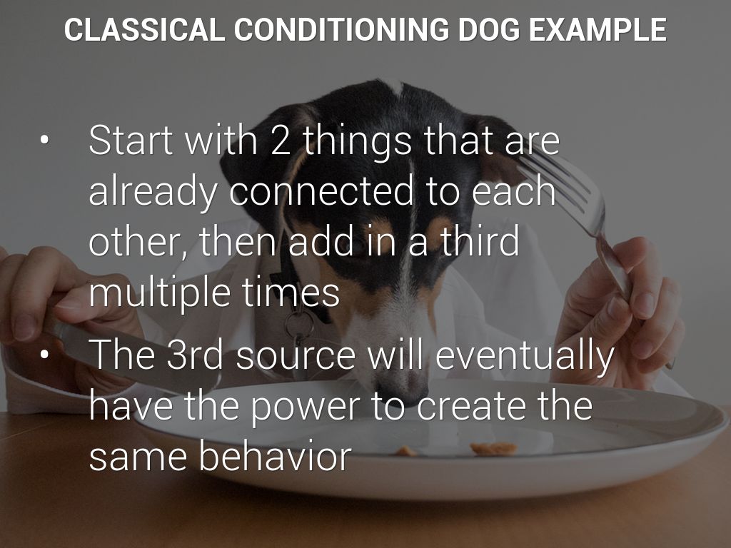First, we start with an existing relationship, Unconditioned Stimulus to an Unconditioned Response. Second, we pair a new thing (Conditioning Stimulus) with the existing relationship, until the new thing has the power to elicit the old response.