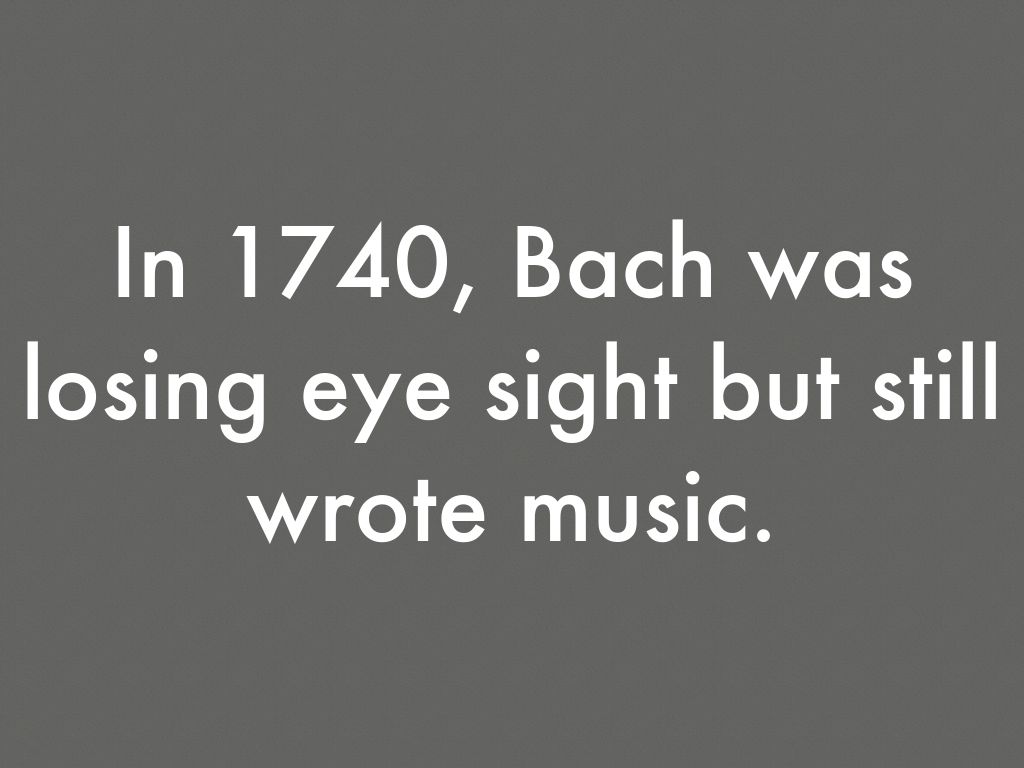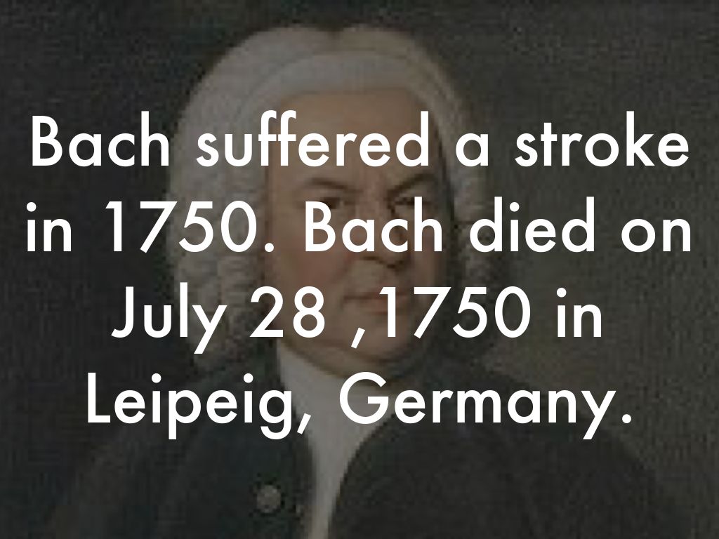 Bach suffered a stroke in 1750. Bach died on July 28 ,1750 in Leipeig, Germany.