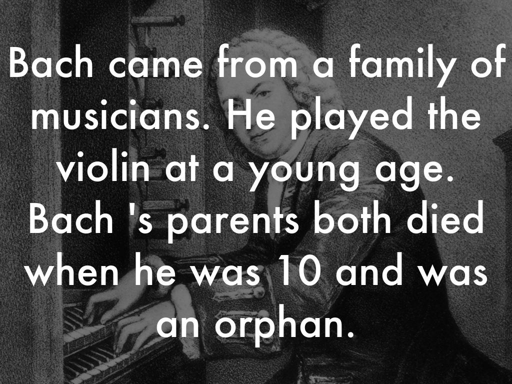 Bach came from a family of musicians. He played the violin at a young age. Bach 's parents both died when he was 10 and was an orphan.