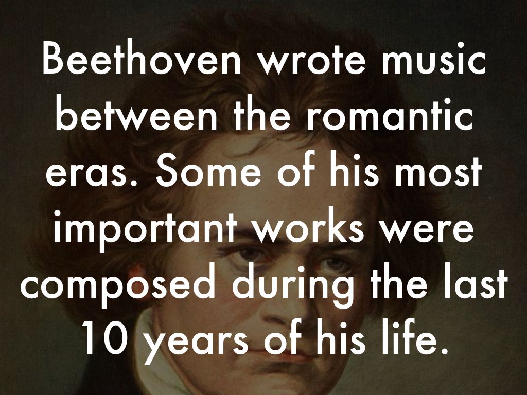 Beethoven wrote music between the romantic eras. Some of his most important works were composed during the last 10 years of his life.