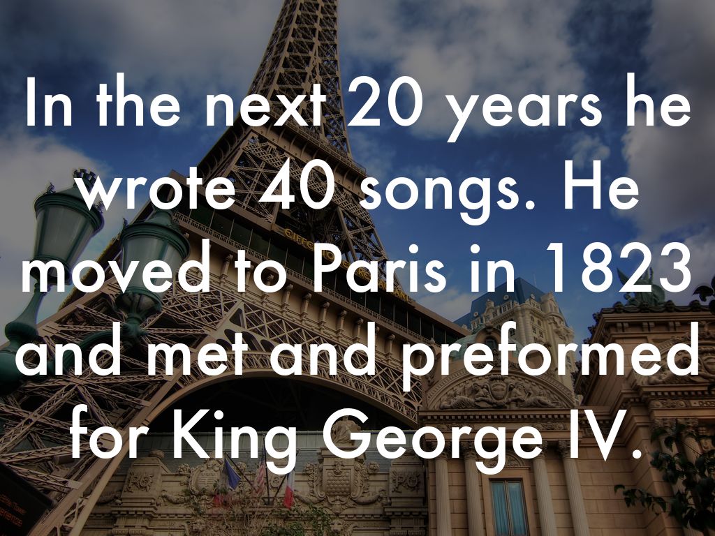 In the next 20 years he wrote 40 songs. He moved to Paris in 1823 and met and preformed for King George IV.