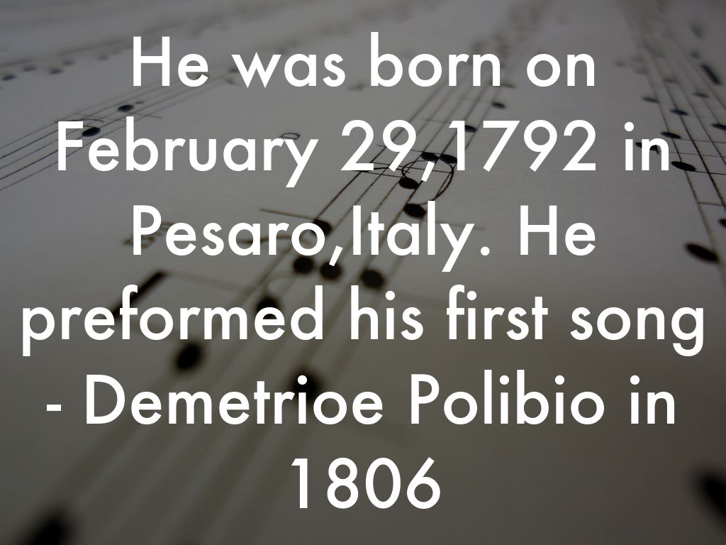 He was born on February 29,1792 in Pesaro,Italy. He preformed his first song - Demetrioe Polibio in 1806