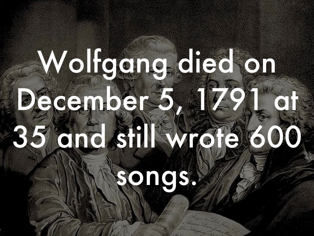 Wolfgang died on December 5, 1791 at 35 and still wrote 600 songs.