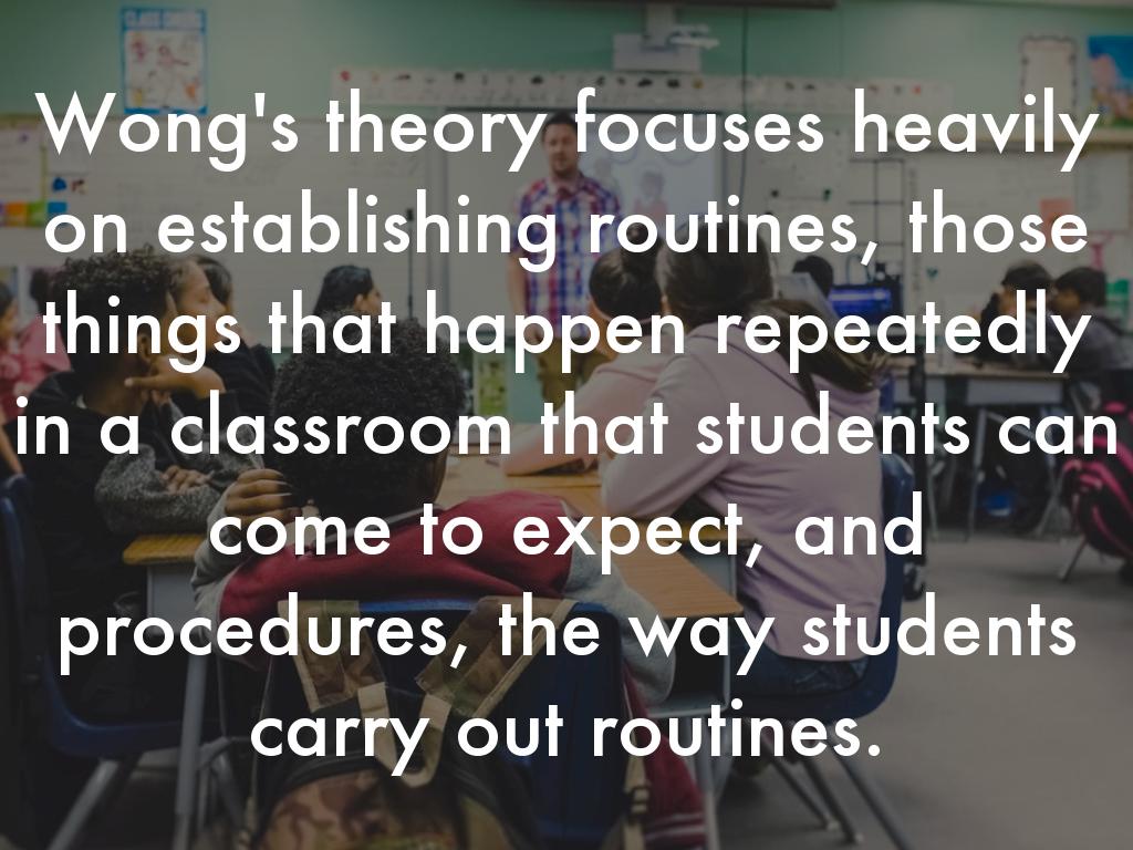 Wong's theory focuses heavily on establishing routines, those things that happen repeatedly in a classroom that students can come to expect, and procedures, the way students carry out routines.