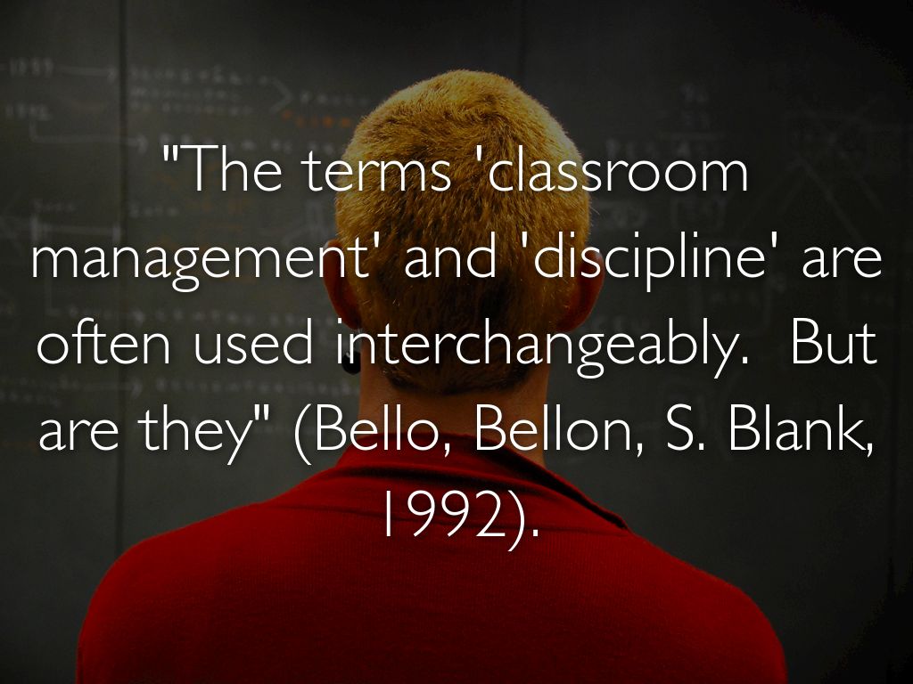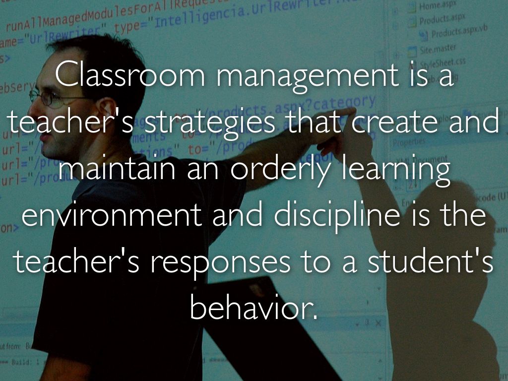 Classroom management is a teacher's strategies that create and maintain an orderly learning environment and discipline is the teacher's responses to a student's behavior.
