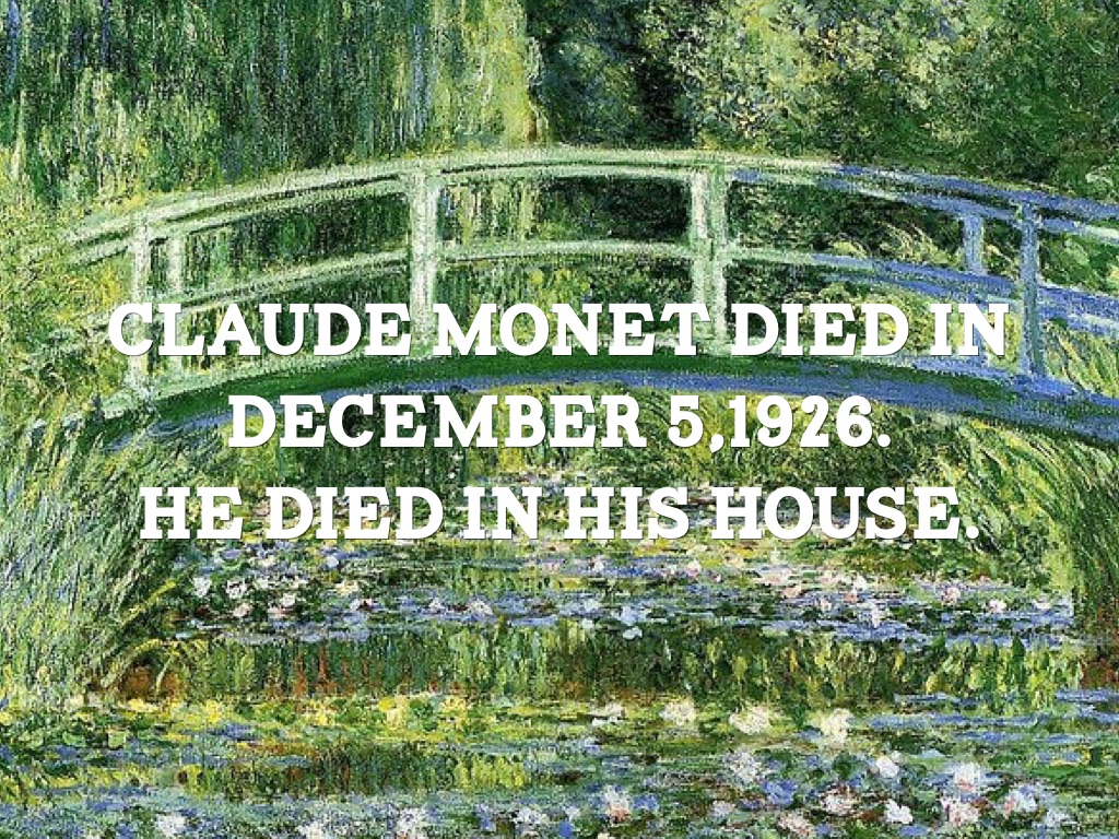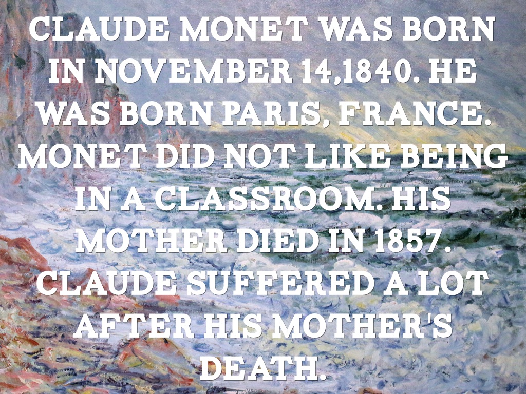 Claude Monet was born in November 14,1840. He was born Paris, France. Monet did not like being in a classroom. His mother died in 1857. Claude suffered a lot after his mother's death.