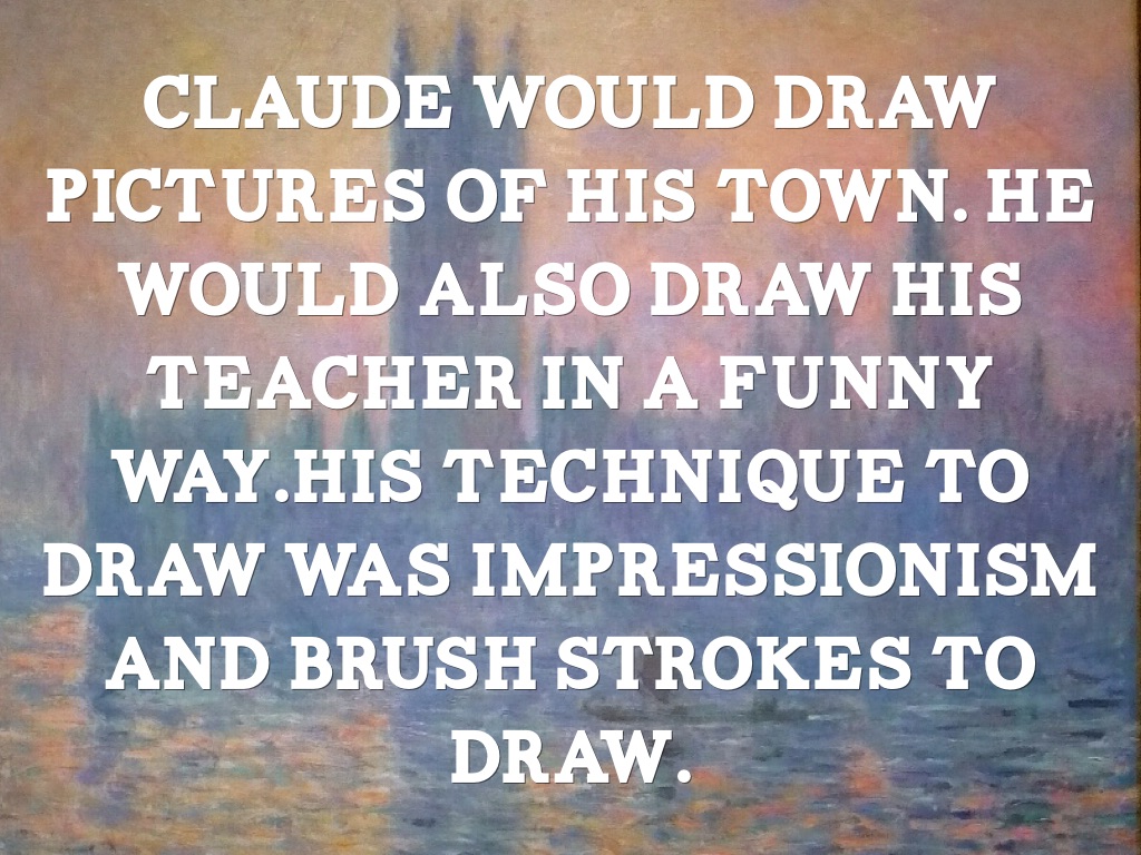 Claude would draw pictures of his town. He would also draw his teacher in a funny way.His technique to draw was Impressionism and brush strokes to draw.