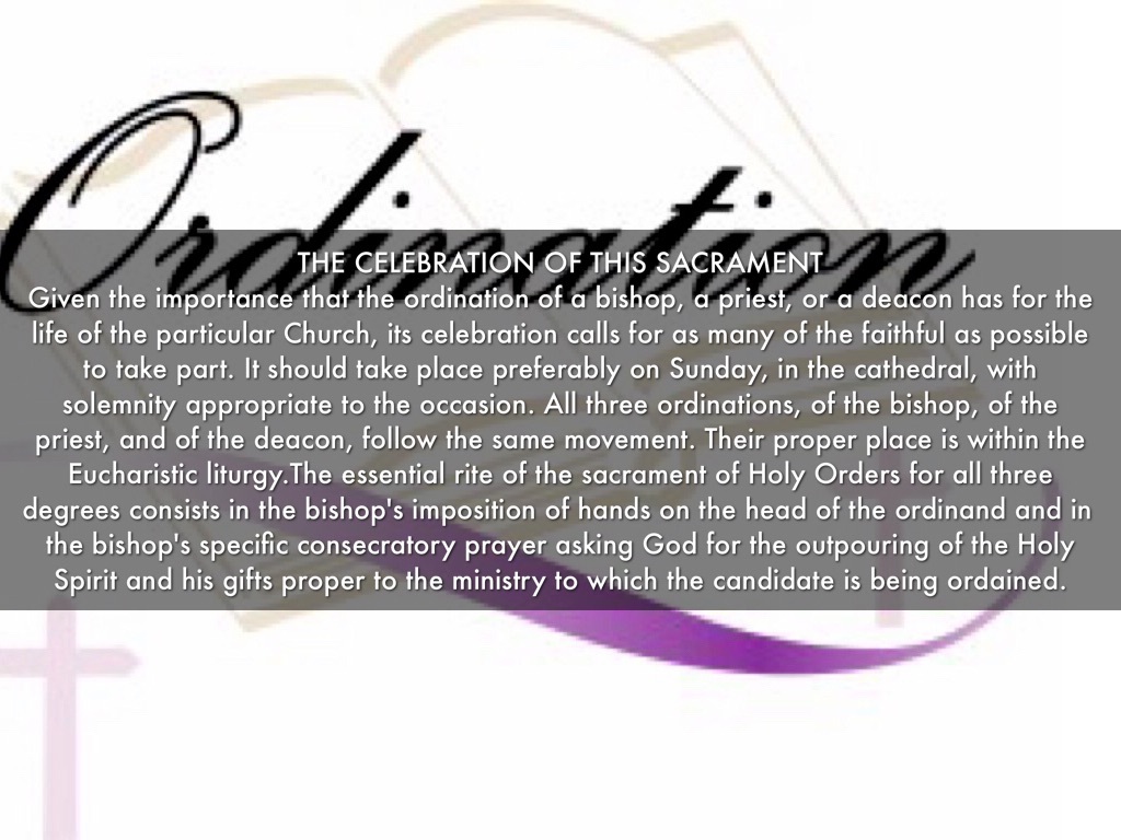 Given the importance that the ordination of a bishop, a priest, or a deacon has for the life of the particular Church, its celebration calls for as many of the faithful as possible to take part. It should take place preferably on Sunday, in the cathedral, with solemnity appropriate to the occasion. All three ordinations, of the bishop, of the priest, and of the deacon, follow the same movement. Their proper place is within the Eucharistic liturgy.The essential rite of the sacrament of Holy Orders for all three degrees consists in the bishop's imposition of hands on the head of the ordinand and in the bishop's specific consecratory prayer asking God for the outpouring of the Holy Spirit and his gifts proper to the ministry to which the candidate is being ordained.