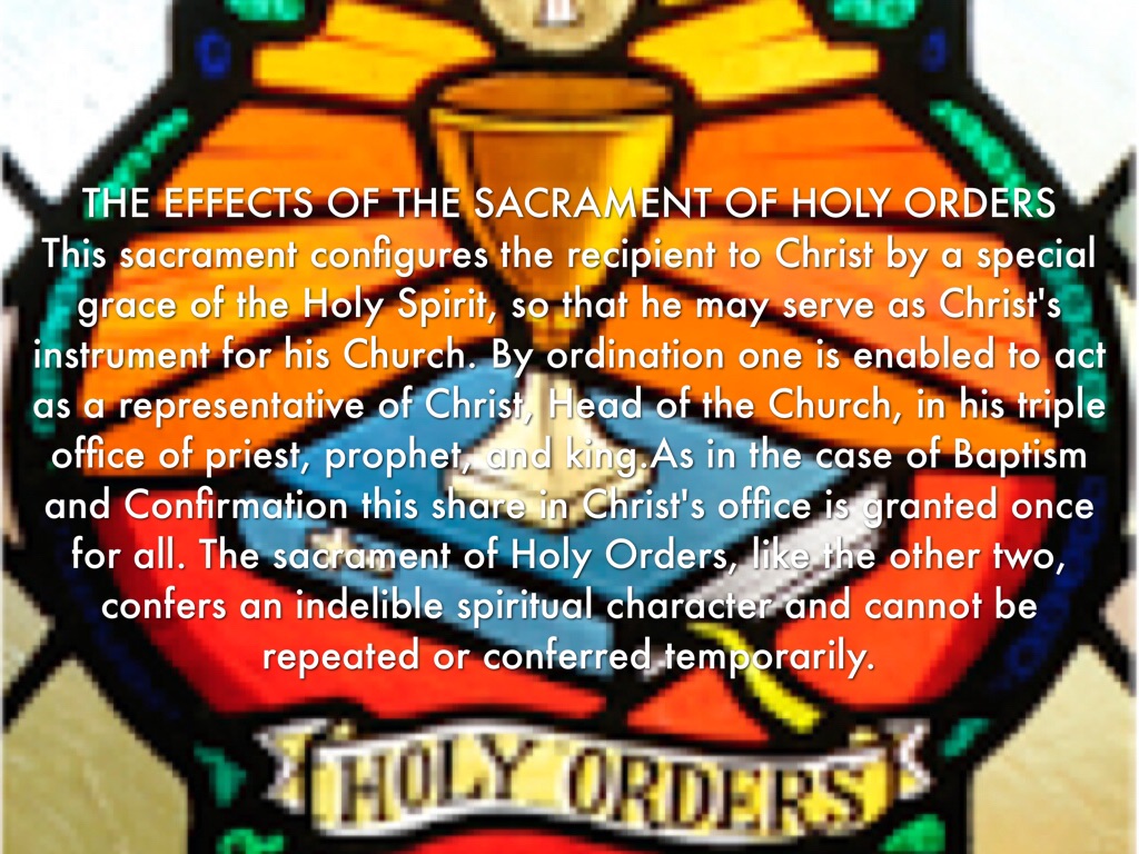 This sacrament configures the recipient to Christ by a special grace of the Holy Spirit, so that he may serve as Christ's instrument for his Church. By ordination one is enabled to act as a representative of Christ, Head of the Church, in his triple office of priest, prophet, and king.As in the case of Baptism and Confirmation this share in Christ's office is granted once for all. The sacrament of Holy Orders, like the other two, confers an indelible spiritual character and cannot be repeated or conferred temporarily.