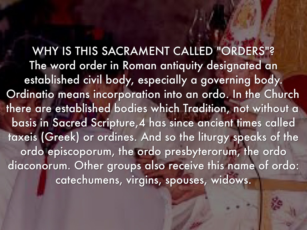 The word order in Roman antiquity designated an established civil body, especially a governing body. Ordinatio means incorporation into an ordo. In the Church there are established bodies which Tradition, not without a basis in Sacred Scripture,4 has since ancient times called taxeis (Greek) or ordines. And so the liturgy speaks of the ordo episcoporum, the ordo presbyterorum, the ordo diaconorum. Other groups also receive this name of ordo: catechumens, virgins, spouses, widows.