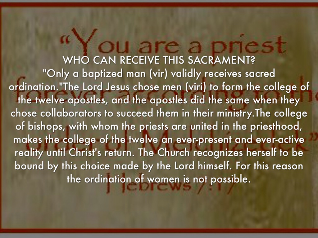 "Only a baptized man (vir) validly receives sacred ordination."The Lord Jesus chose men (viri) to form the college of the twelve apostles, and the apostles did the same when they chose collaborators to succeed them in their ministry.The college of bishops, with whom the priests are united in the priesthood, makes the college of the twelve an ever-present and ever-active reality until Christ's return. The Church recognizes herself to be bound by this choice made by the Lord himself. For this reason the ordination of women is not possible.