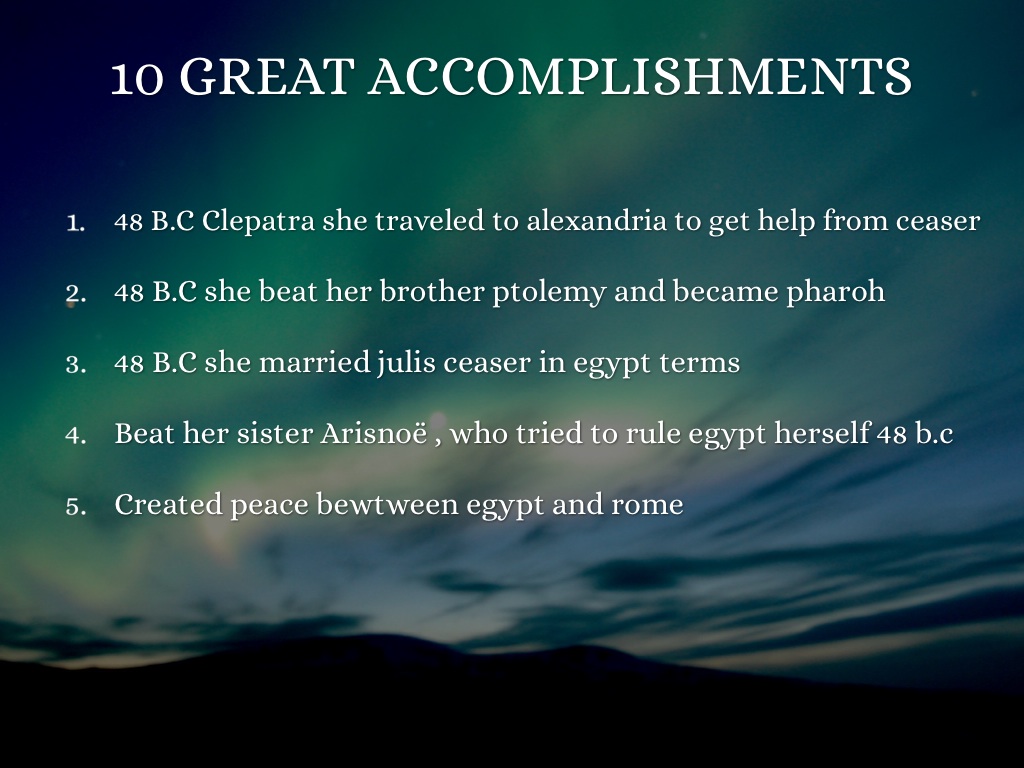 • 48 B.C Clepatra she traveled to alexandria to get help from ceaser