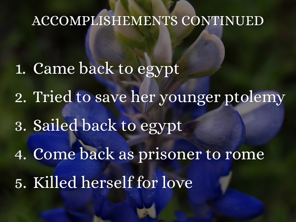 • Beat her sister Arisnoë , who tried to rule egypt herself 48 b.c