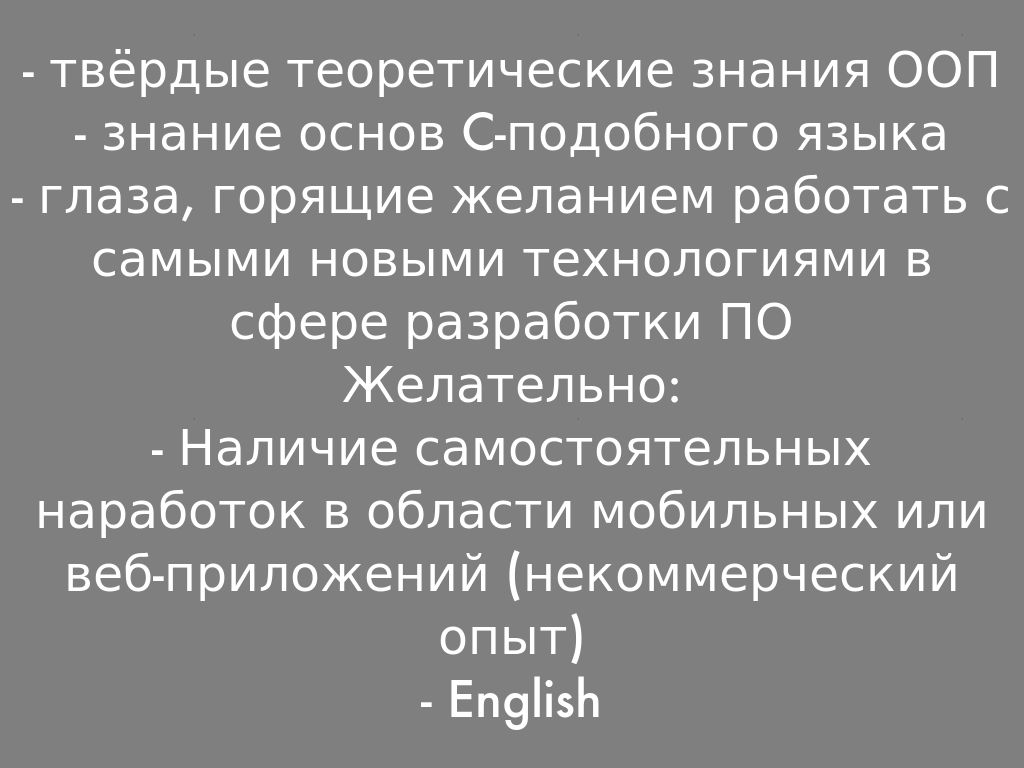 - глаза, горящие желанием работать с самыми новыми технологиями в сфере разработки ПО