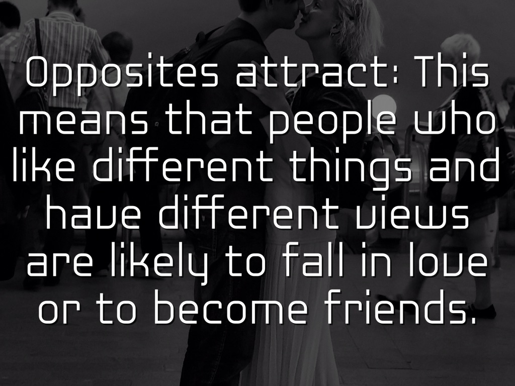 Opposites attract: This means that people who like different things and have different views are likely to fall in love or to become friends.