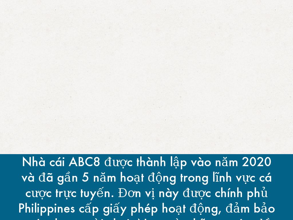 Nhà cái ABC8 được thành lập vào năm 2020 và đã gần 5 năm hoạt động trong lĩnh vực cá cược trực tuyến. Đơn vị này được chính phủ Philippines cấp giấy phép hoạt động, đảm bảo uy tín cho người chơi. Ngay từ những ngày đầu ra mắt, ABC8 đã tạo nên cơn sốt nhờ vào các sản phẩm chất lượng và sự chú trọng đến hoạt động săn thưởng của hội viên.