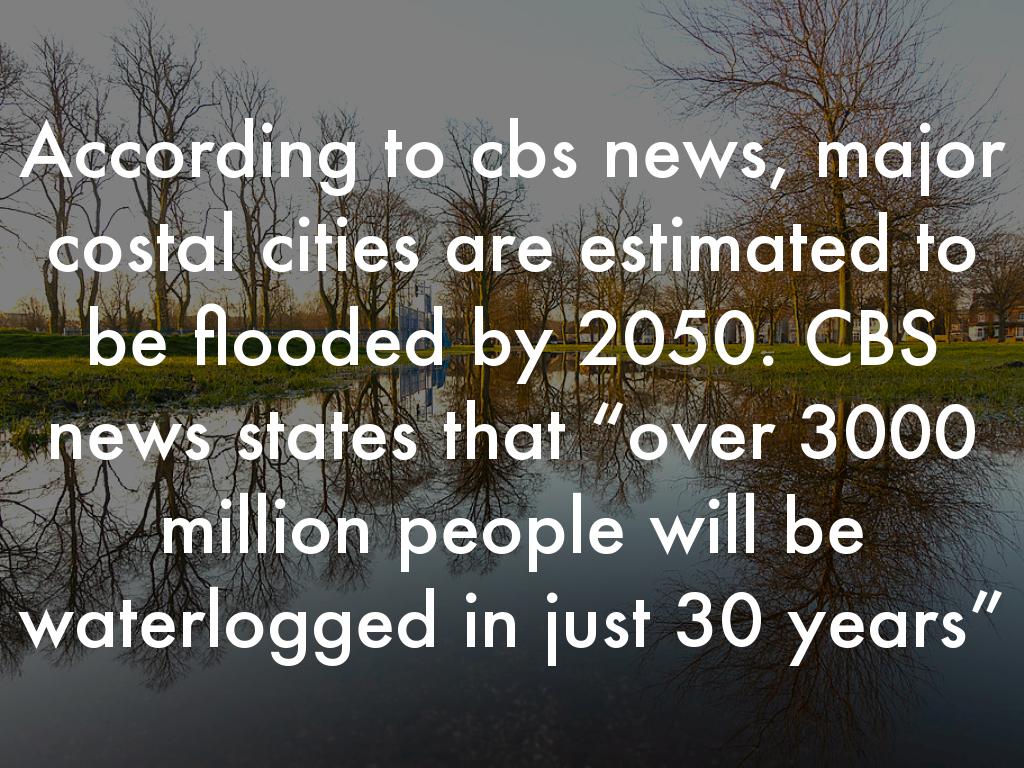 According to cbs news, major costal cities are estimated to be flooded by 2050. CBS news states that “over 3000 million people will be waterlogged in just 30 years”
