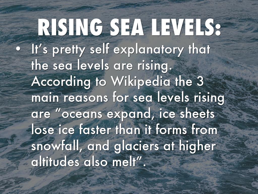 It’s pretty self explanatory that the sea levels are rising. According to Wikipedia the 3 main reasons for sea levels rising are “oceans expand, ice sheets lose ice faster than it forms from snowfall, and glaciers at higher altitudes also melt”.