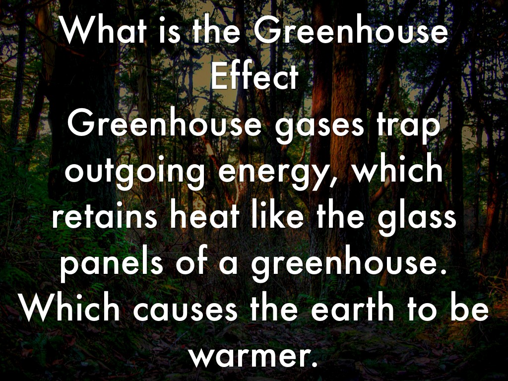 Greenhouse gases trap outgoing energy, which retains heat like the glass panels of a greenhouse. Which causes the earth to be warmer.