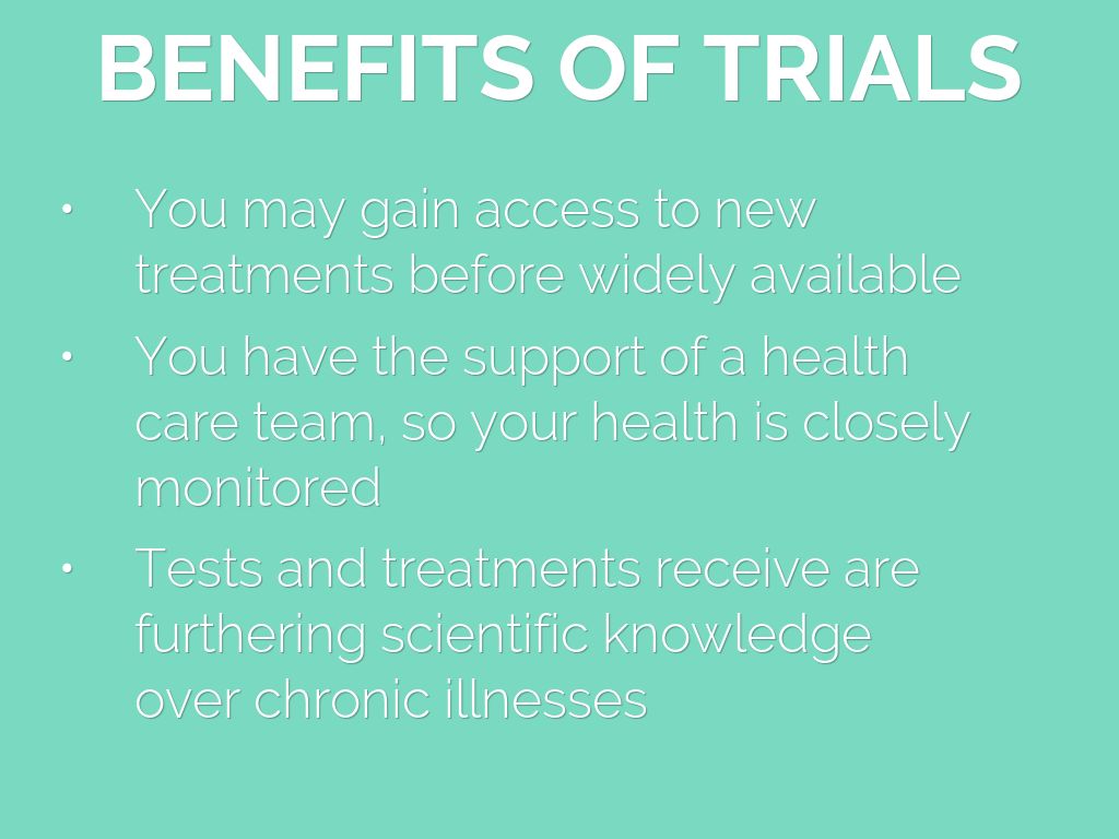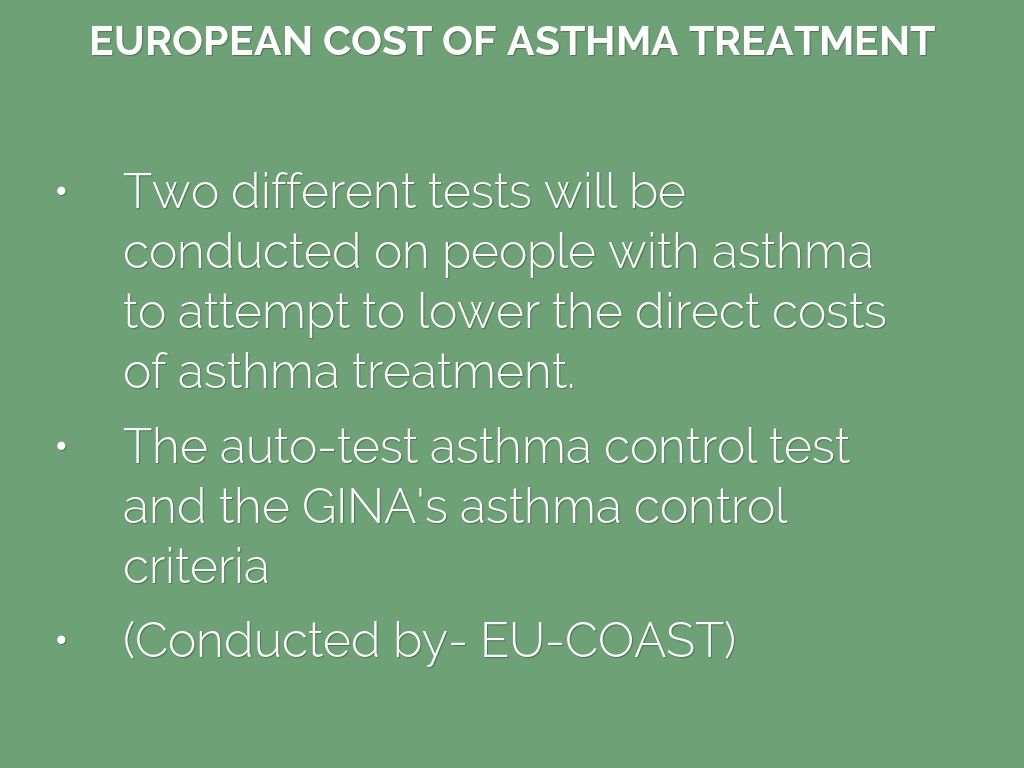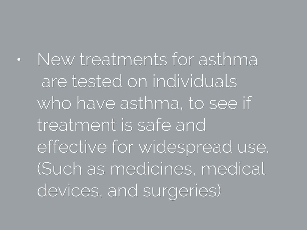 New treatments for asthma are tested on individuals who have asthma, to see if treatment is safe and effective for widespread use. (Such as medicines, medical devices, and surgeries)