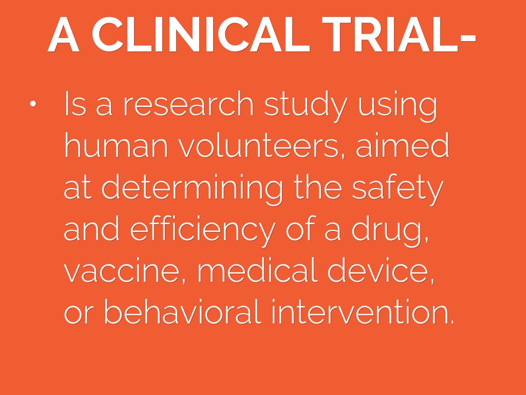 Is a research study using human volunteers, aimed at determining the safety and efficiency of a drug, vaccine, medical device, or behavioral intervention.