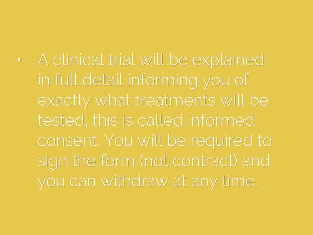 A clinical trial will be explained in full detail informing you of exactly what treatments will be tested, this is called informed consent. You will be required to sign the form (not contract) and you can withdraw at any time.