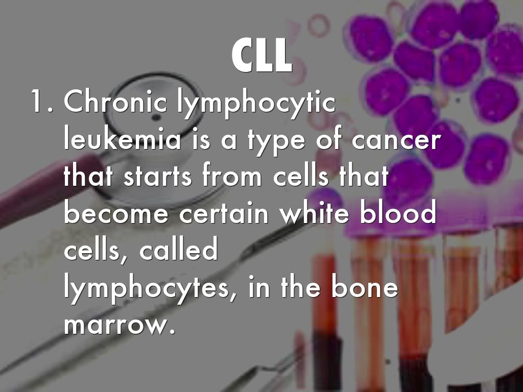 • Chronic lymphocytic leukemia is a type of cancer that starts from cells that become certain white blood cells, called lymphocytes, in the bone marrow.