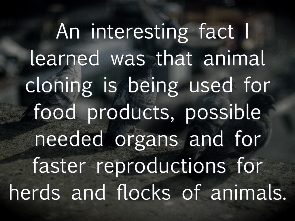 An interesting fact I learned was that animal cloning is being used for food products, possible needed organs and for faster reproductions for herds and flocks of animals.