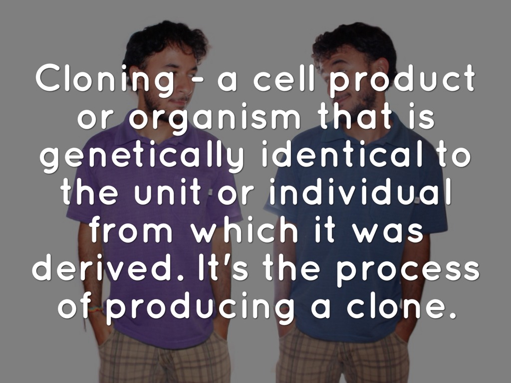 Cloning - a cell product or organism that is genetically identical to the unit or individual from which it was derived. It's the process of producing a clone.