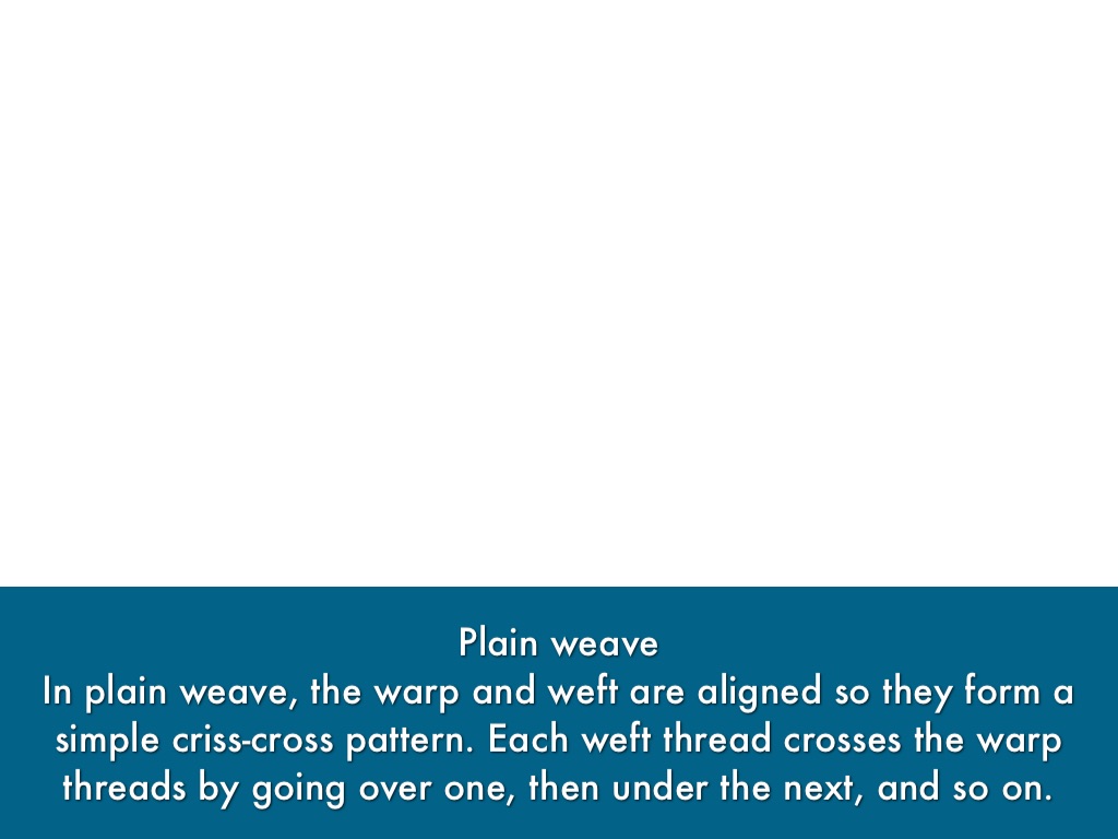 In plain weave, the warp and weft are aligned so they form a simple criss-cross pattern. Each weft thread crosses the warp threads by going over one, then under the next, and so on.