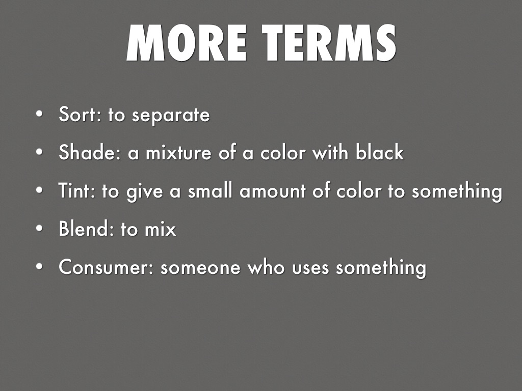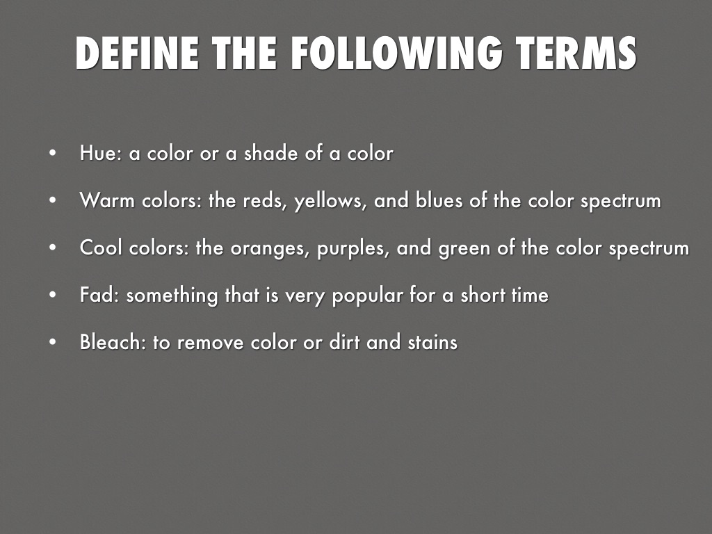 - Warm colors: the reds, yellows, and blues of the color spectrum