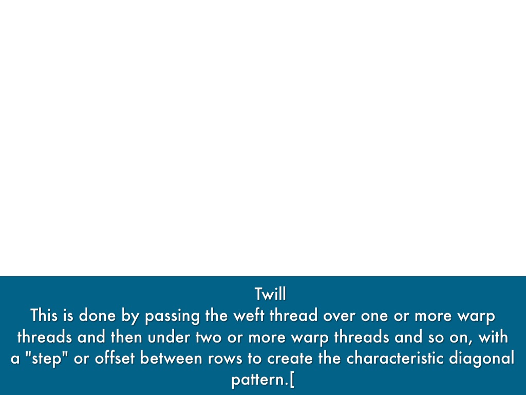 This is done by passing the weft thread over one or more warp threads and then under two or more warp threads and so on, with a "step" or offset between rows to create the characteristic diagonal pattern.[