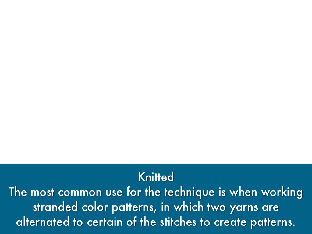 The most common use for the technique is when working stranded color patterns, in which two yarns are alternated to certain of the stitches to create patterns.