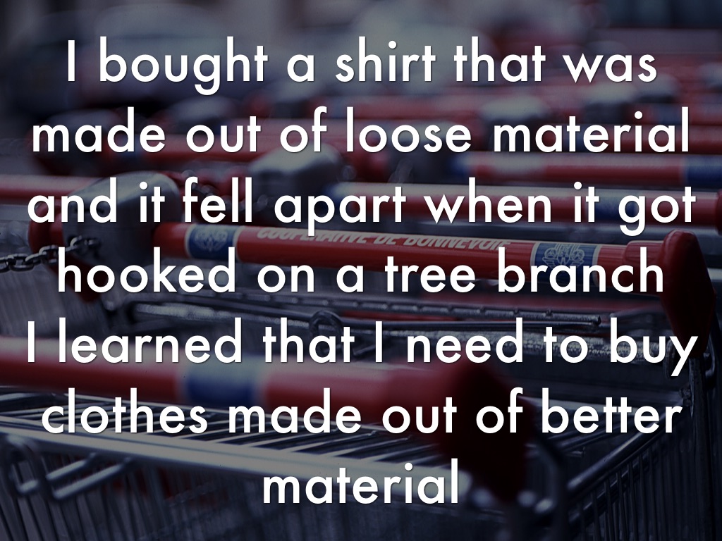 I bought a shirt that was made out of loose material and it fell apart when it got hooked on a tree branch