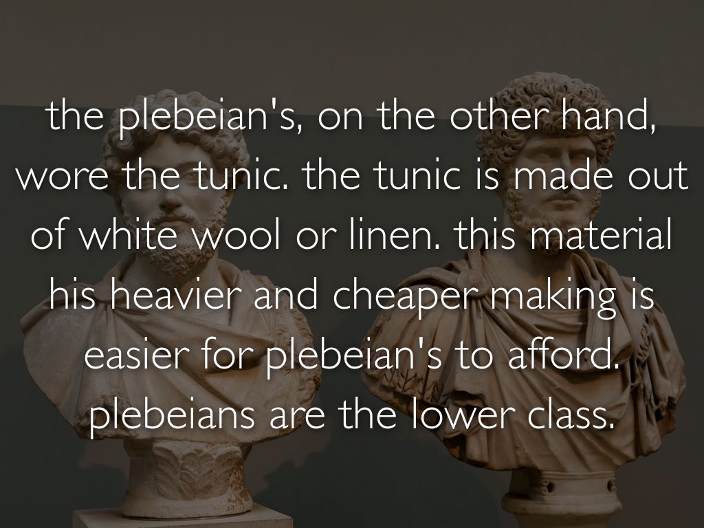 the plebeian's, on the other hand, wore the tunic. the tunic is made out of white wool or linen. this material his heavier and cheaper making is easier for plebeian's to afford. plebeians are the lower class.
