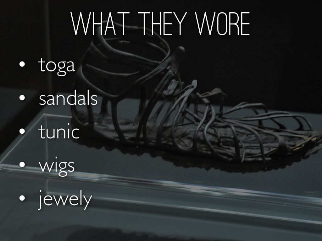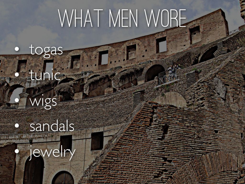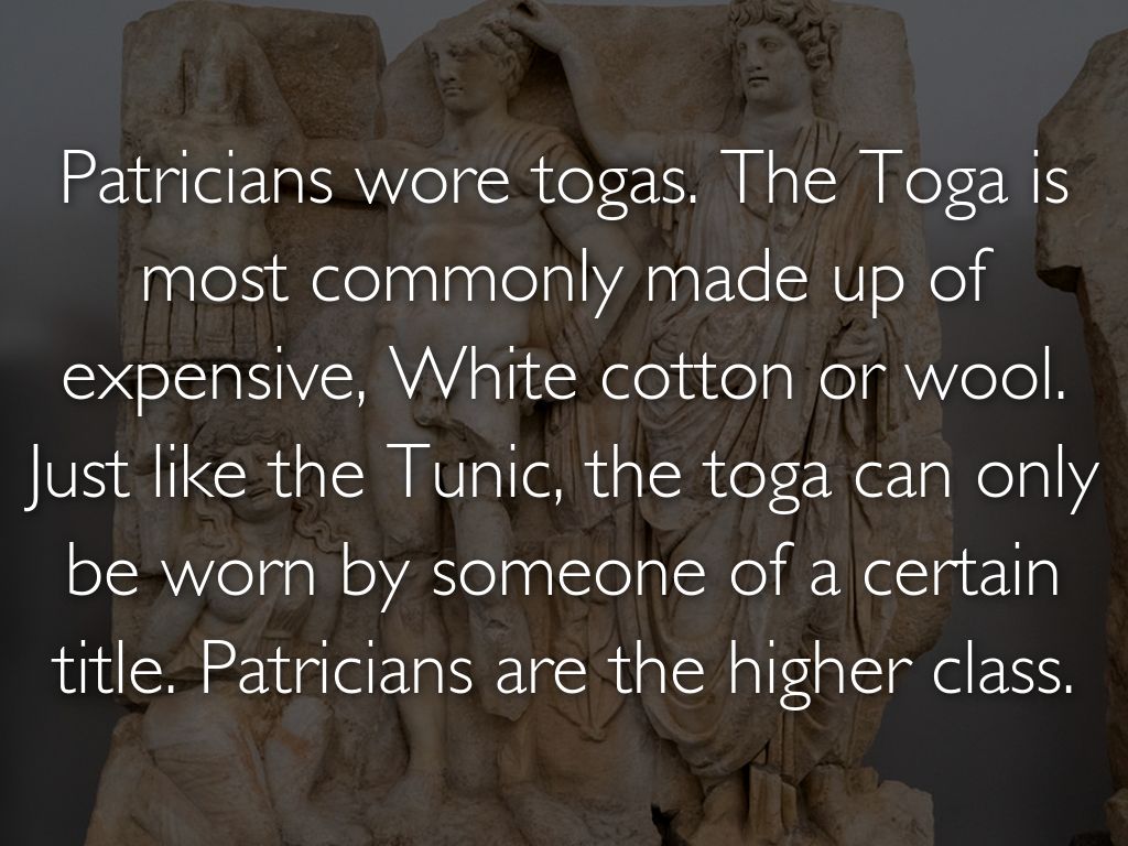 Patricians wore togas. The Toga is most commonly made up of expensive, White cotton or wool. Just like the Tunic, the toga can only be worn by someone of a certain title. Patricians are the higher class.