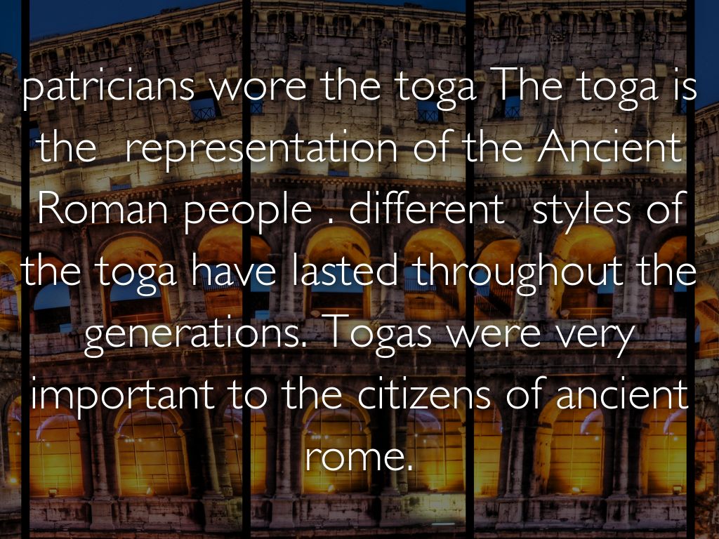patricians wore the toga The toga is the representation of the Ancient Roman people . different styles of the toga have lasted throughout the generations. Togas were very important to the citizens of ancient rome.