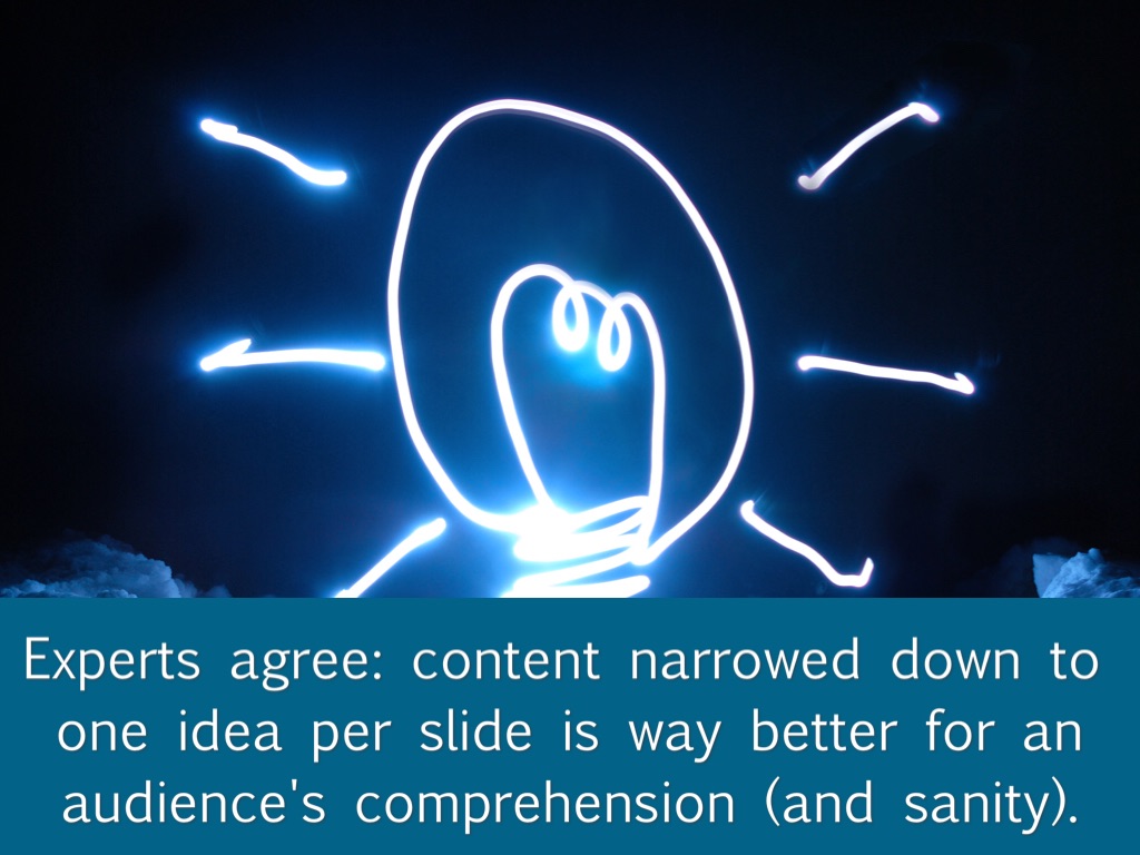 Ever suffered through a presentation packed with tiny text, read aloud word by word? Experts agree: content narrowed down to one idea per slide is way better for an audience's comprehension (and sanity).