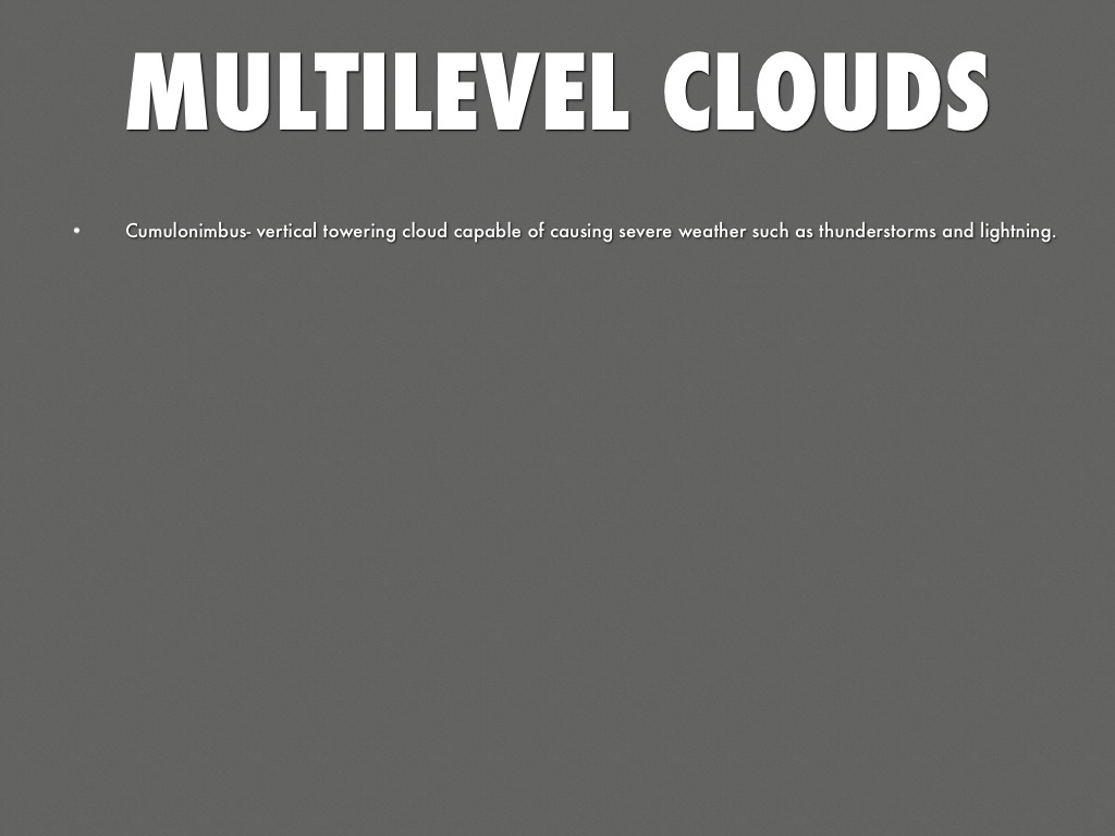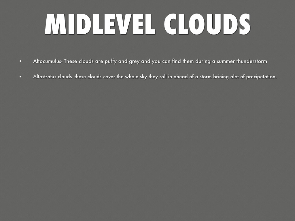 Altostratus clouds- these clouds cover the whole sky they roll in ahead of a storm brining alot of precipetation.