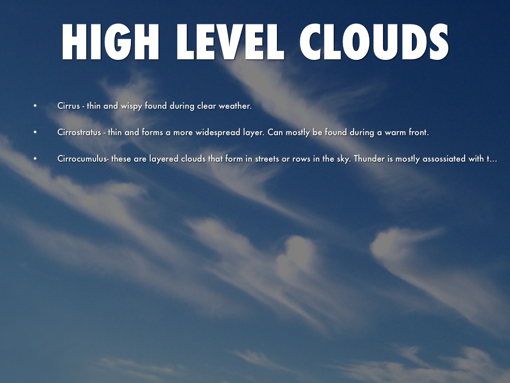 Cirrocumulus- these are layered clouds that form in streets or rows in the sky. Thunder is mostly assossiated with this cloud.
