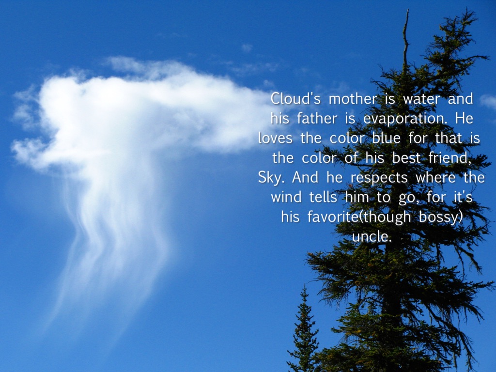 Cloud's mother is water and his father is evaporation. He loves the color blue for that is the color of his best friend, Sky. And he respects where the wind tells him to go, for it's his favorite(though bossy) uncle.